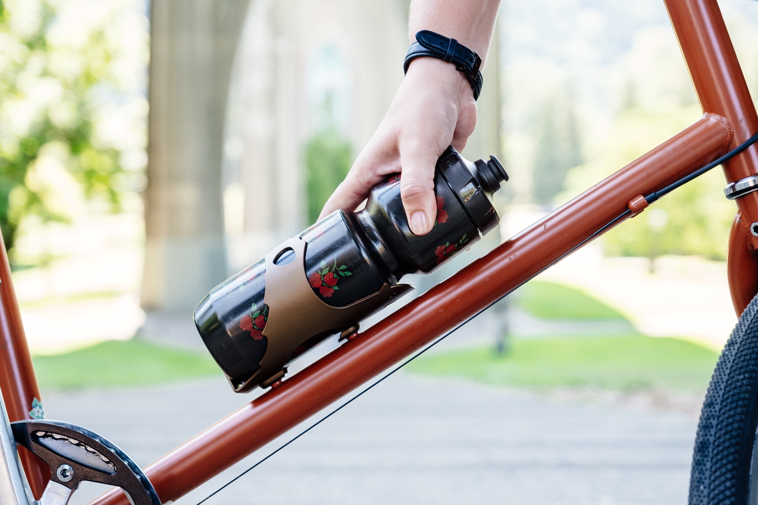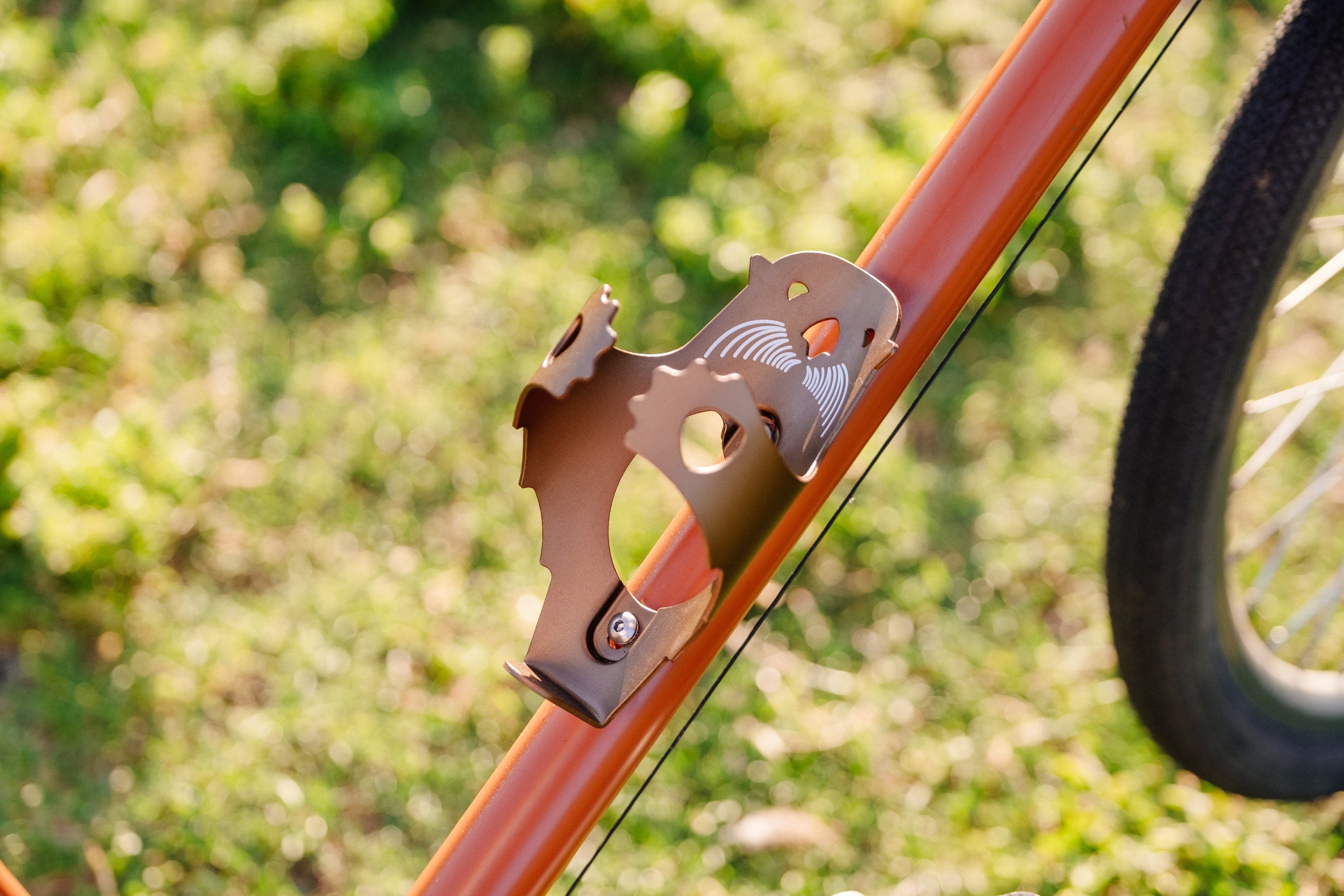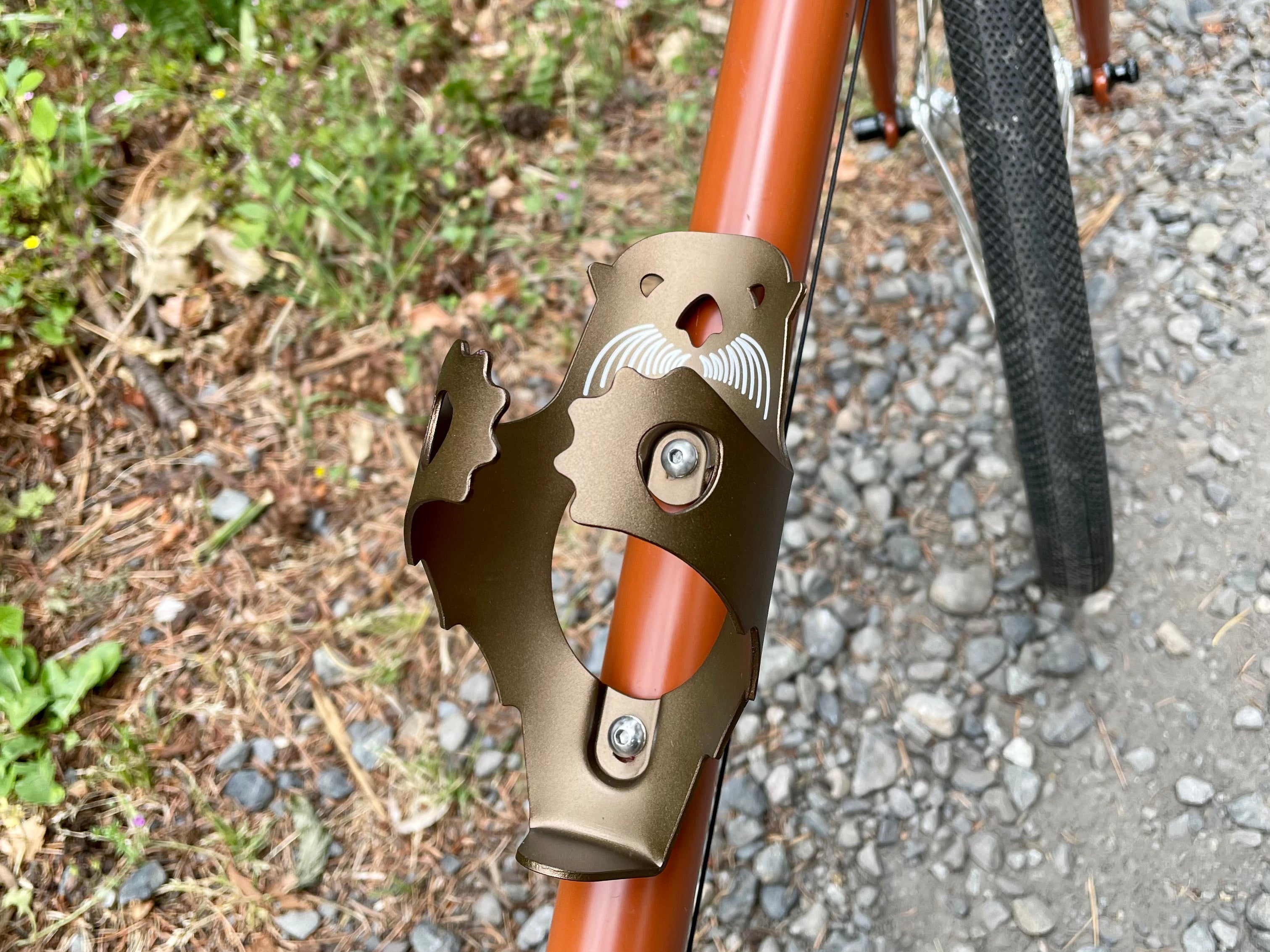 The Otter Cage is made from a single sheet of lightweight 5052 alloy. The arms of the otter cradle your water bottle nice and tight like a mama otter floating on her back with her pup.